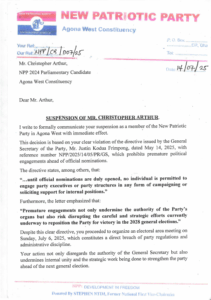 The New Patriotic Party (NPP) has suspended its 2024 parliamentary candidate for Agona West, Christopher Arthur, for breaching a directive issued by the party’s General Secretary, Justin Frimpong Kodua, which prohibits internal campaign activities for party positions.