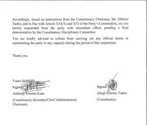 In a letter jointly signed by the constituency secretary, Anthony Kwame Kum, and chairman, Alhaji Gibrine Tanko, Arthur was accused of convening an electoral area meeting on Sunday, July 6, 2025. The party described the meeting as a clear violation of party regulations and an act of administrative indiscipline.