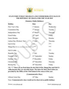 In a statement issued on Thursday, 31, 2025, in line with the Public Holidays and Commemorative Days (Amendment) Act, 2025, the ministry reminded the public of the official list of statutory holidays for the year, as approved by the President.